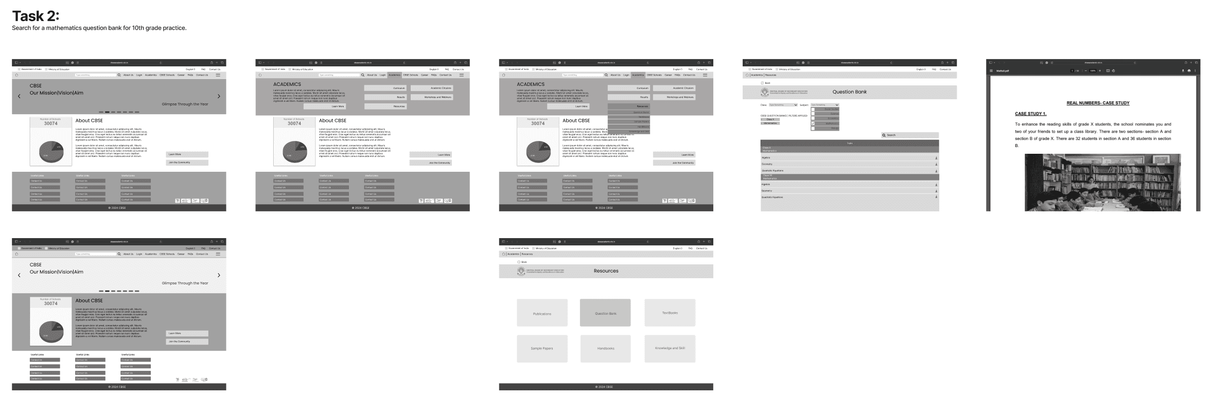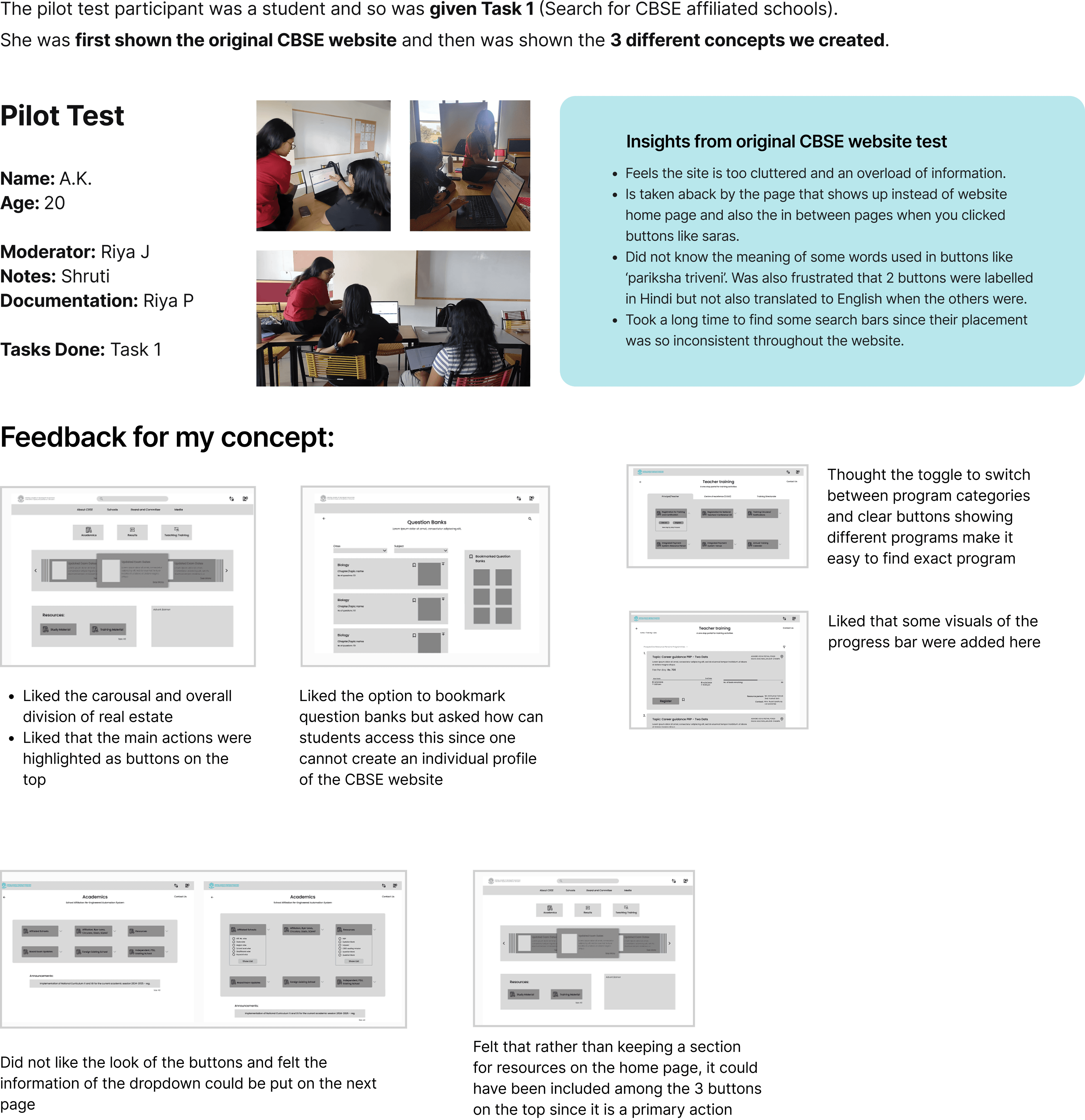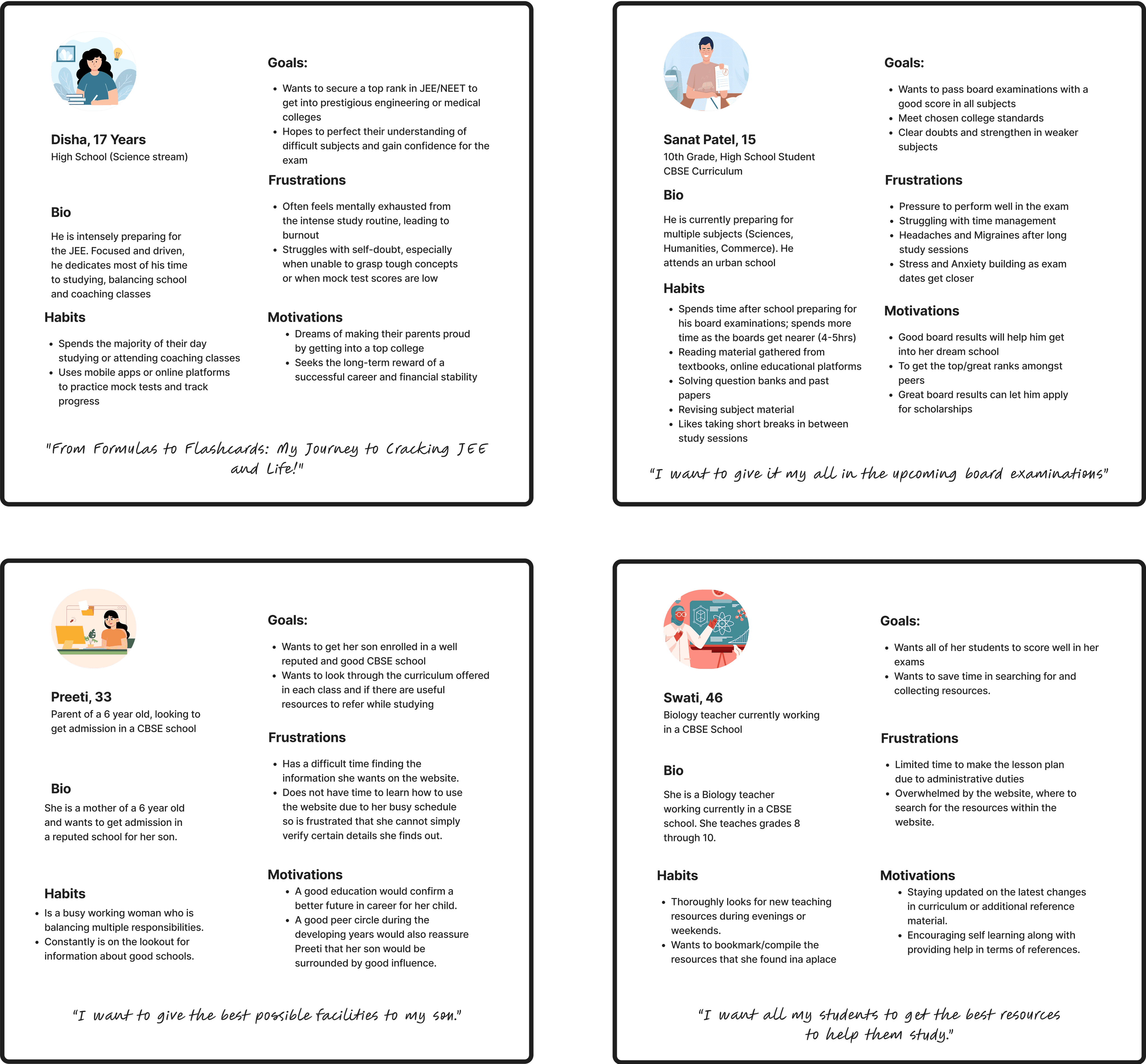First, we extensively looked through the CBSE website and narrowed down to 4 major existing flows that would be visited often by the users. Additionally, we also defined our user groups and made respective personas.