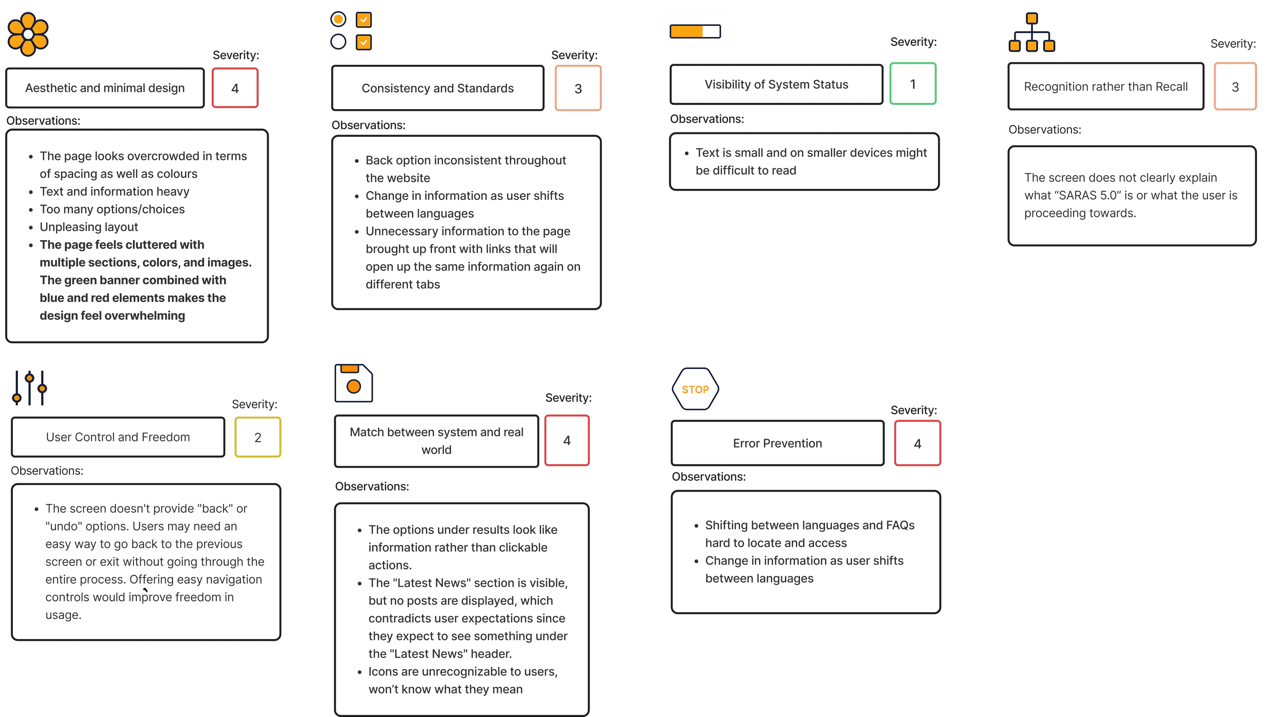 While some heuristic violations we spot were similar, others were opposing. In that case, we went back to the strategy and decided whether the observation was even a violation or not and accordingly framed the heuristic evaluation.